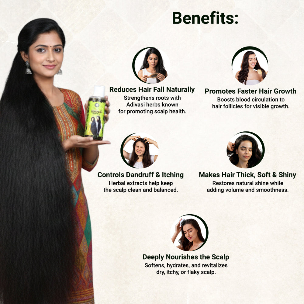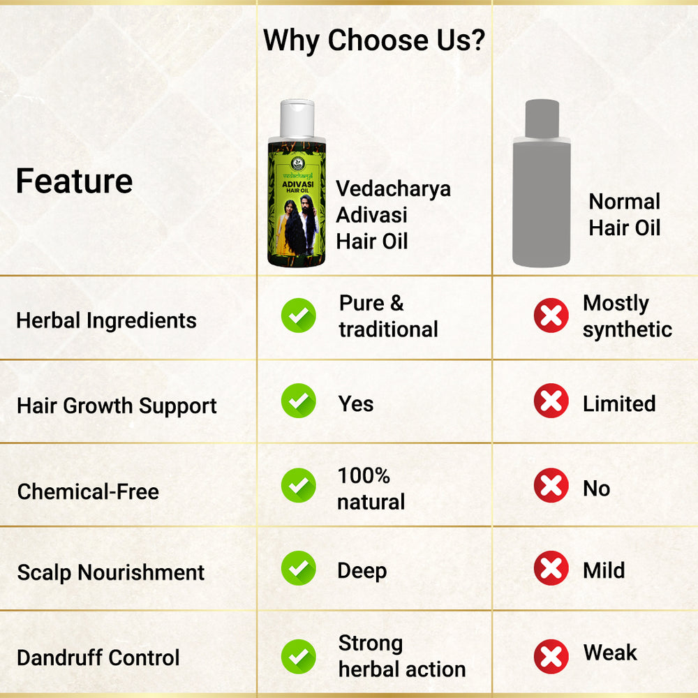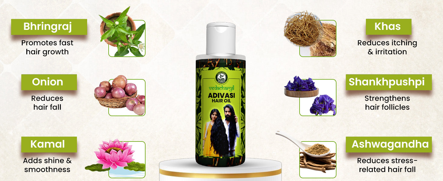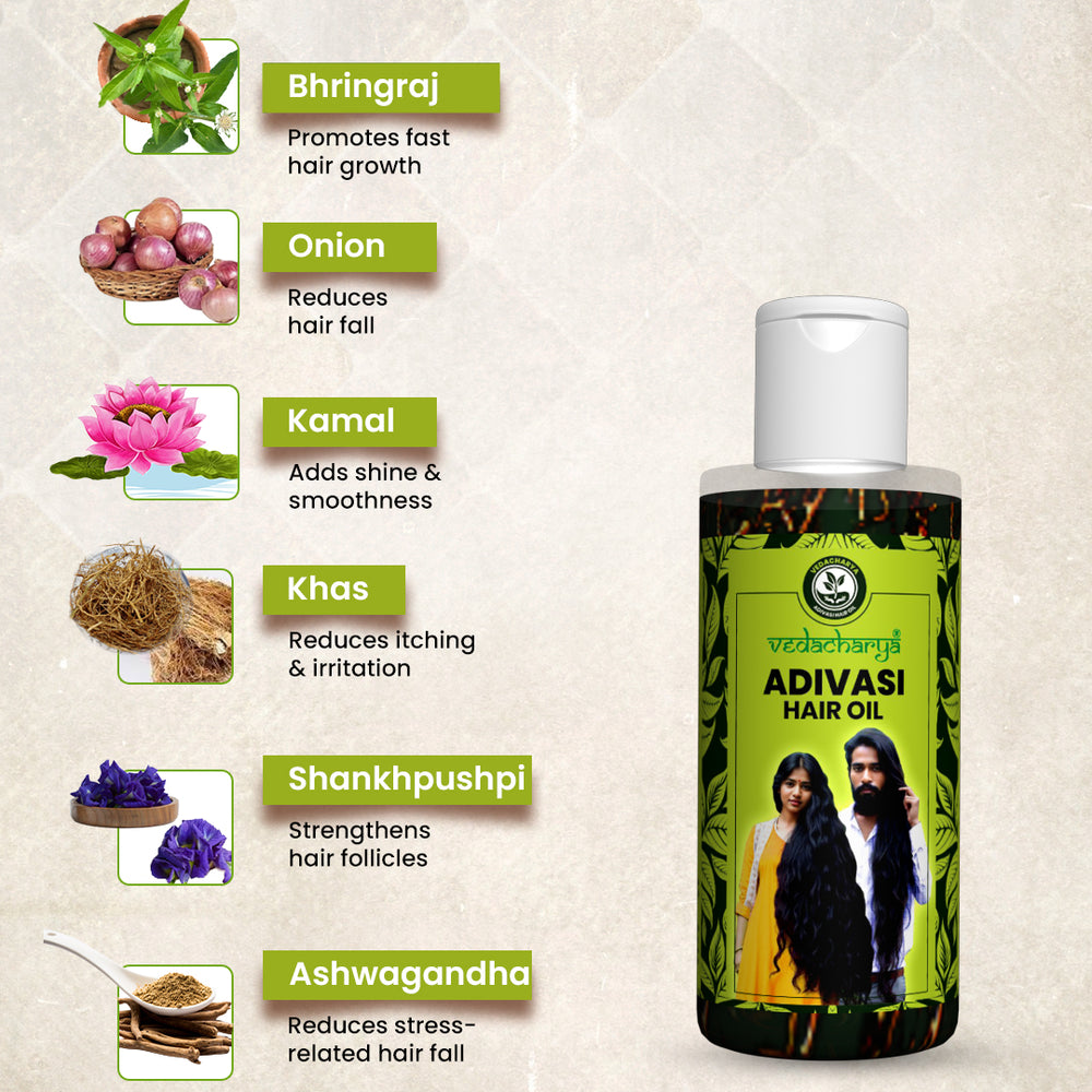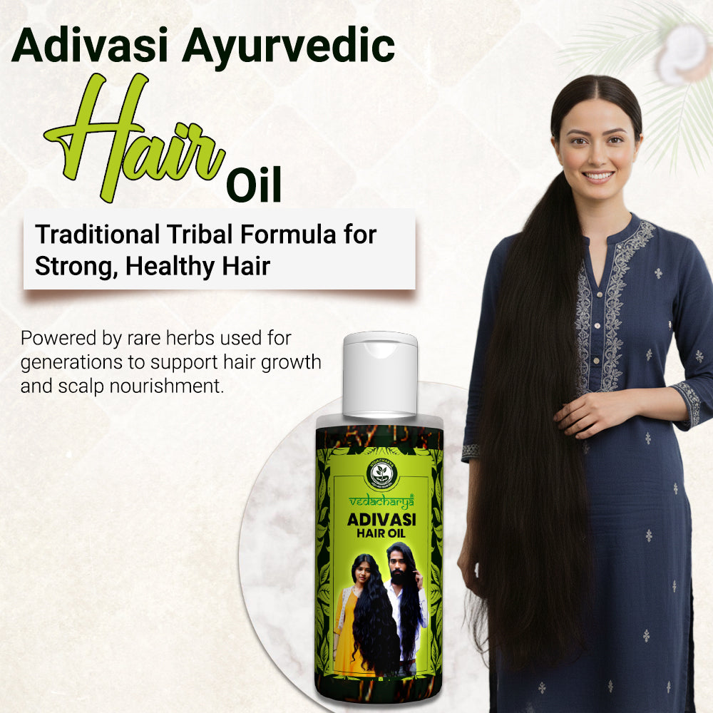 Vedacharya Adivasi Herbal Hair Oil is based on ancient tribal and Ayurvedic knowledge which help to maintain beautiful hair like yourself. It's not just another hair product. Made from nature's best ingredients, it addresses various hair problems like hair fall, dandruff, and early graying. But beyond solving these issues, it also nourishes and adds shine to your hair. Using this oil is like getting into the trusted remedies of our ancestors, ensuring that every strand gets the care it truly deserves. So, if you're looking for an all-round solution that offers both repair and nourishment, the Adivasi Herbal Hair Oil is your answer.