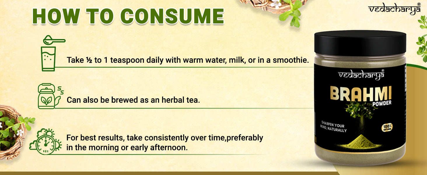 Take 1 teaspoon (3–5 g) of Vedacharya Brahmi Powder once or twice daily with warm water, milk, or honey, or as directed by your physician.