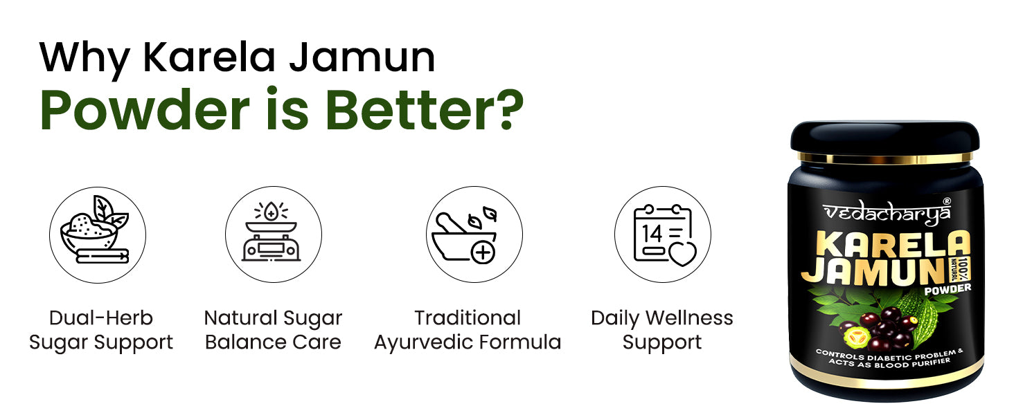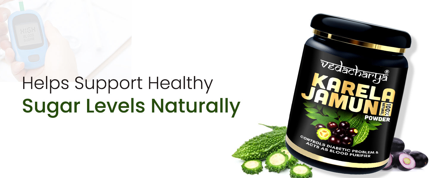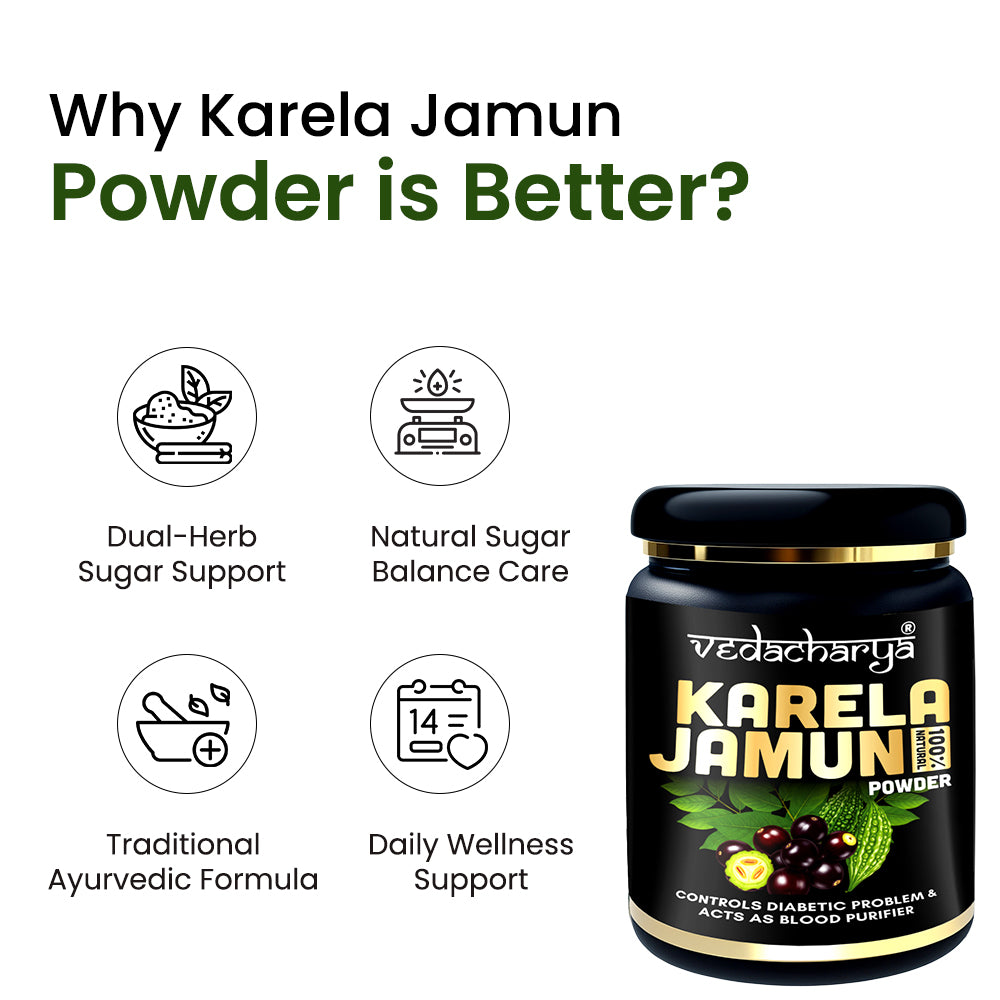 Vedacharya Karela Jamun Powder are powerful Ayurvedic herbs renowned for their numerous health benefits. Combined, their synergistic effects are amplified, making them an effective natural remedy for various health conditions. This unique combination helps regulate blood sugar levels, boost digestion, purify the blood, and enhance immunity, promoting optimal health and vitaliy. Vedacharya Karela Jamun Powder is a valuable addition to your diabetes care routine. Formulated with the purest extracts of Neem, Karela, and Jamun, it is further enriched with potent herbs like Amla, Ashwagandha, and Shilajit to amplify its effectiveness. This herbal blend supports healthy blood sugar levels, aids digestion, and contributes to overall vitality. It also promotes better gut health and helps ease common digestive issues such as gas, bloating, and discomfort.