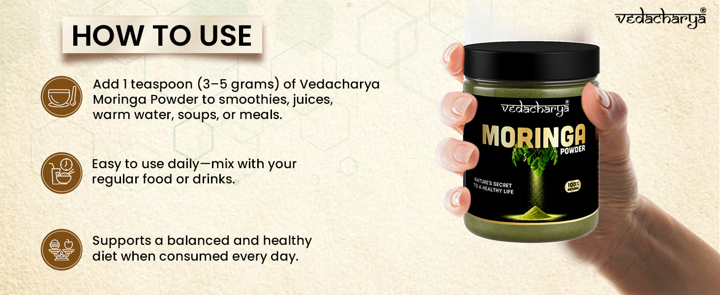 Mix 1 teaspoon of Vedacharya Moringa Powder with warm water or add it to juices or meals.