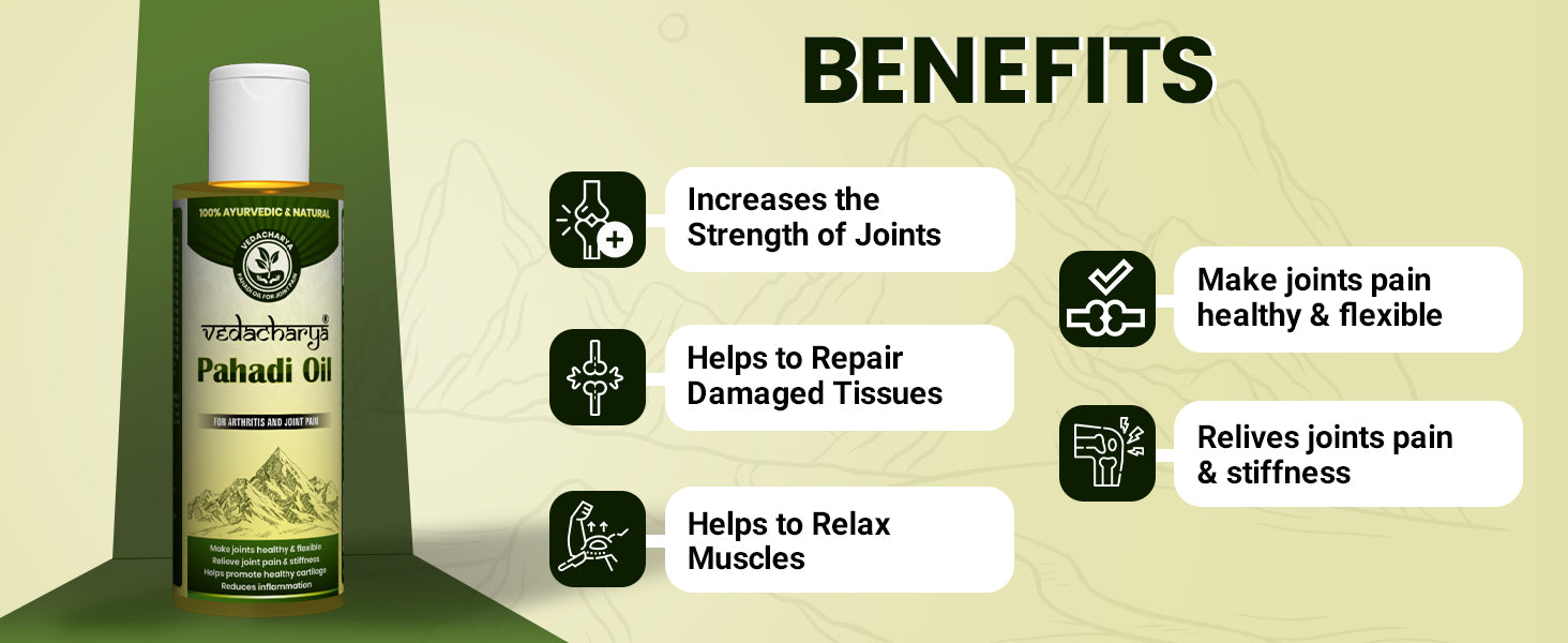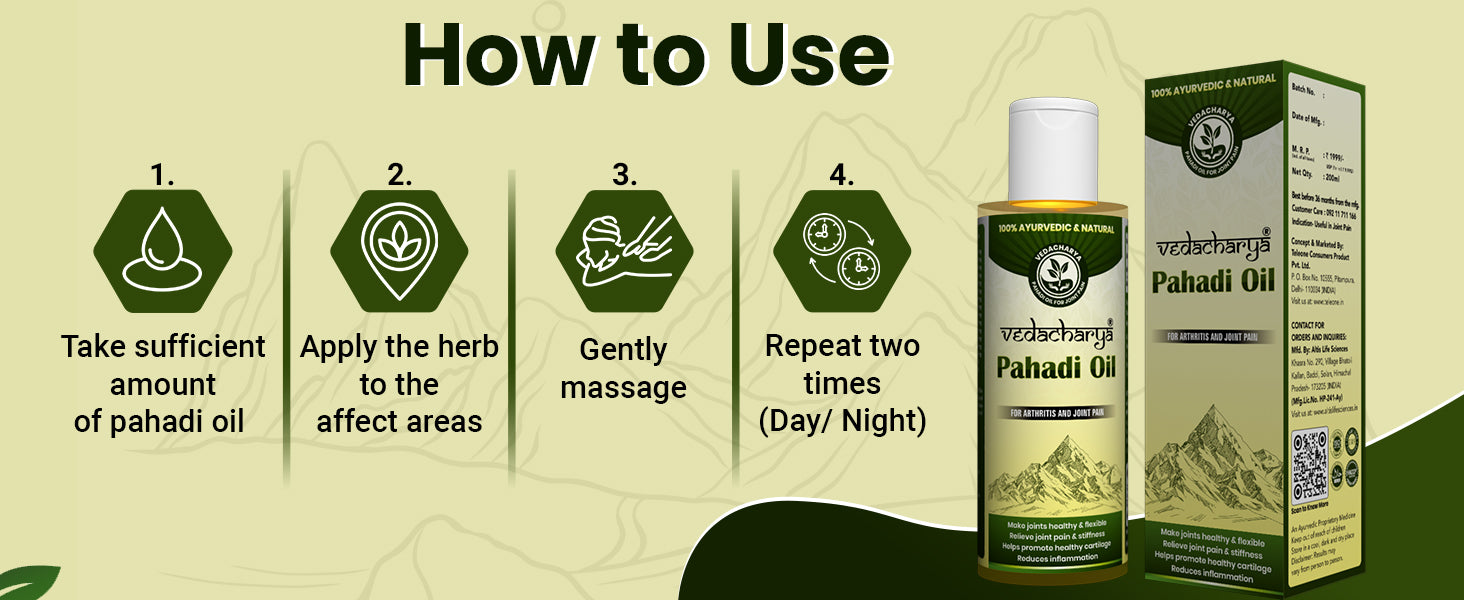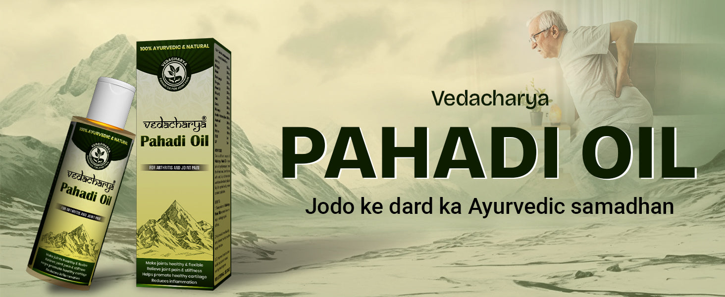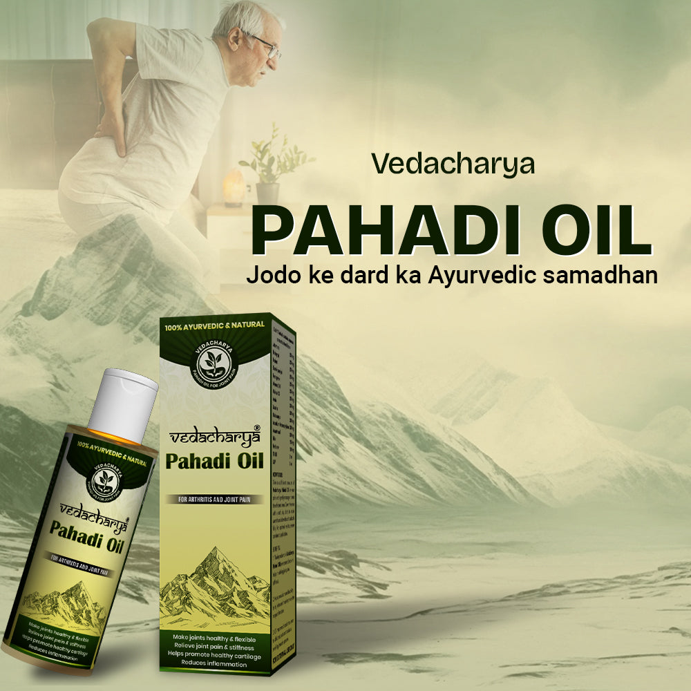 Vedacharya Pahadi Oil is a special Ayurvedic oil made from natural herbs and modern science. It is designed to give quick, deep, and long-lasting relief from joint and muscle pain like stiffness, swelling.