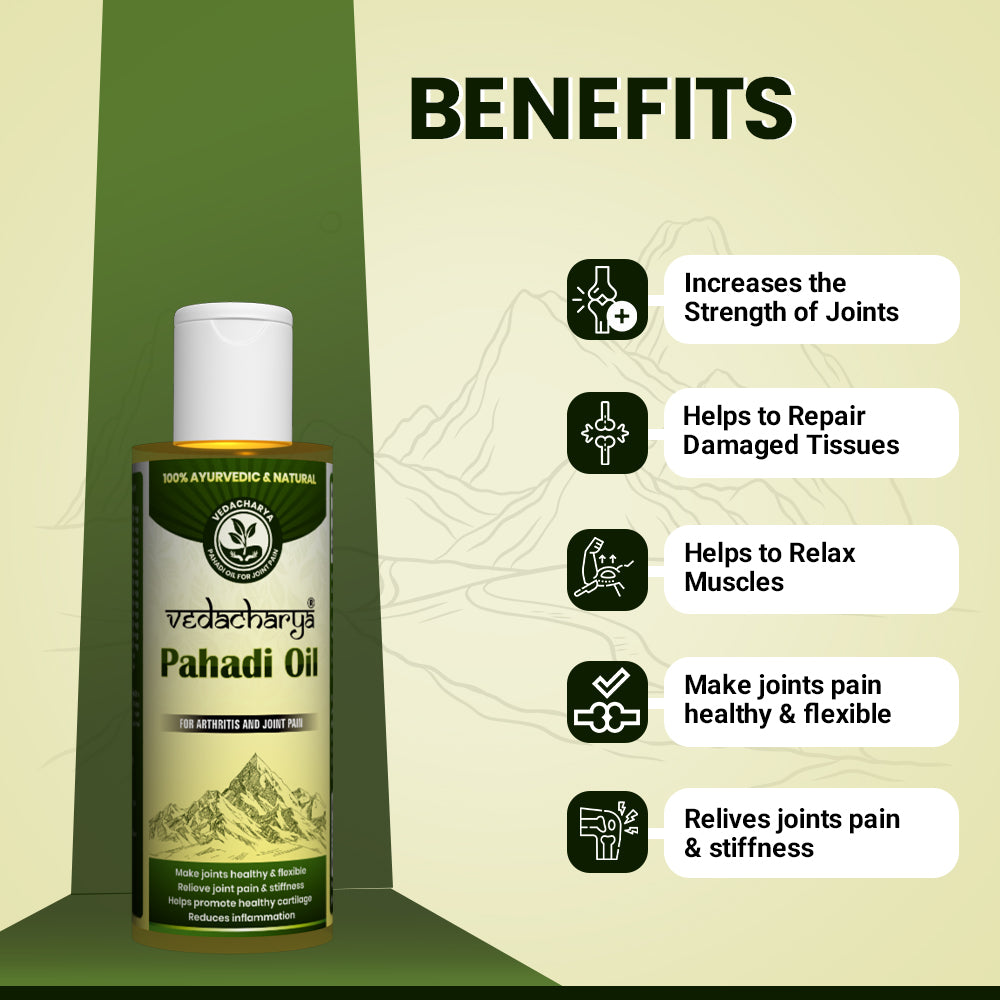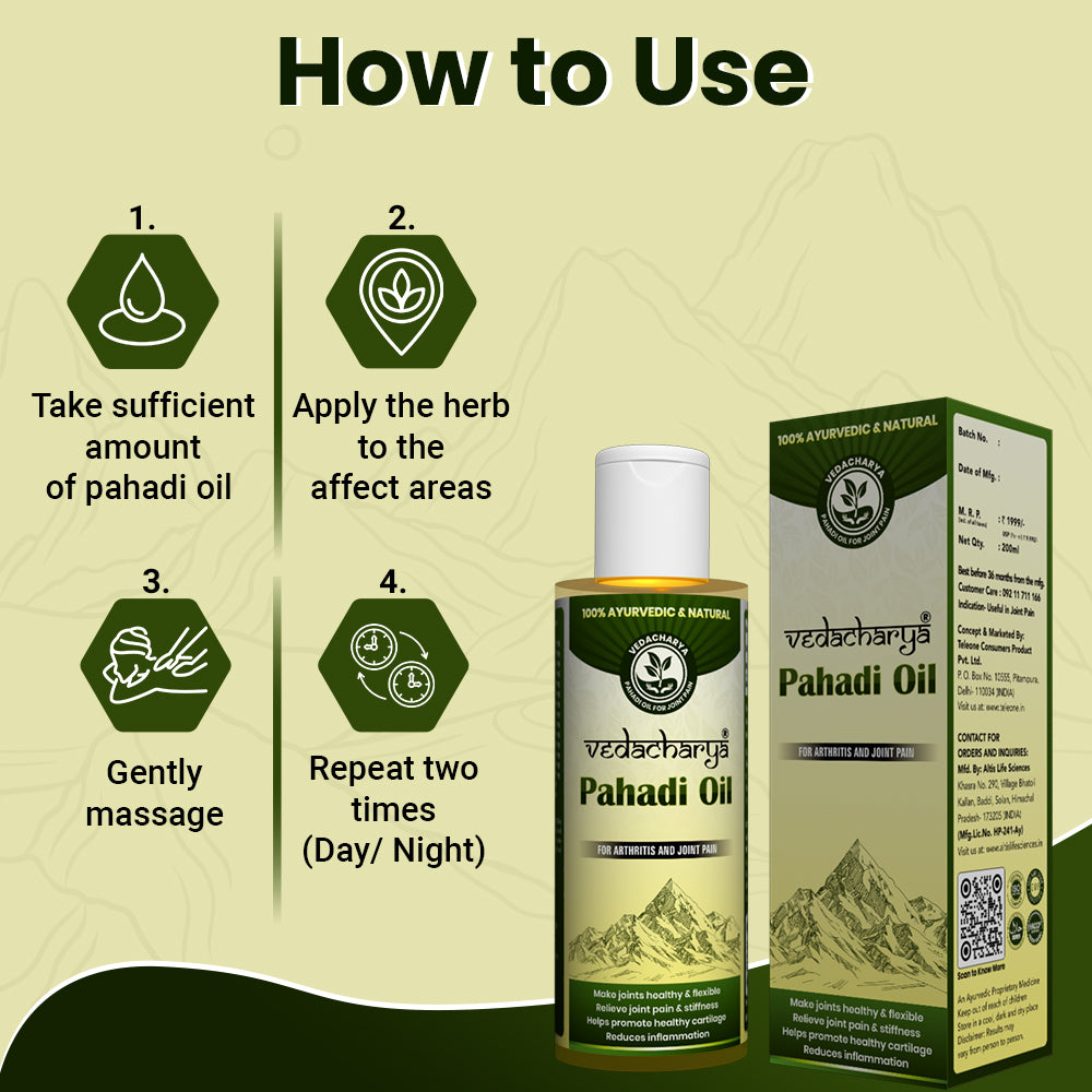 Vedacharya Pahadi Oil is a special Ayurvedic oil made from natural herbs and modern science. It is designed to give quick, deep, and long-lasting relief from joint and muscle pain like stiffness, swelling.