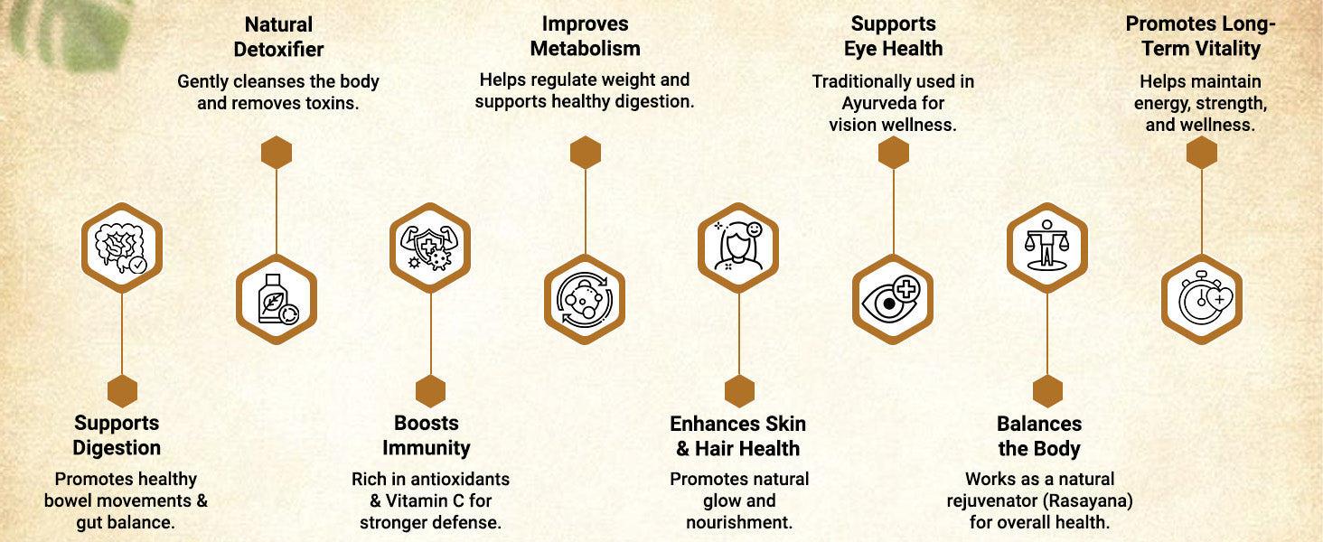 • Amla (Emblica officinalis):A natural source of Vitamin C and powerful antioxidants, Amla supports immunity, skin health, and digestion.