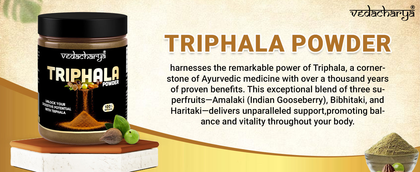Experience the time-tested benefits of Ayurveda with Vedacharya Triphala Powder, a powerful herbal formulation made from the dried fruits of three revered botanicals: Amla (Indian Gooseberry), Haritaki, and Bibhitaki. Known for its gentle cleansing properties, Triphala has been used for centuries to promote digestive health, detoxification, and internal balance.